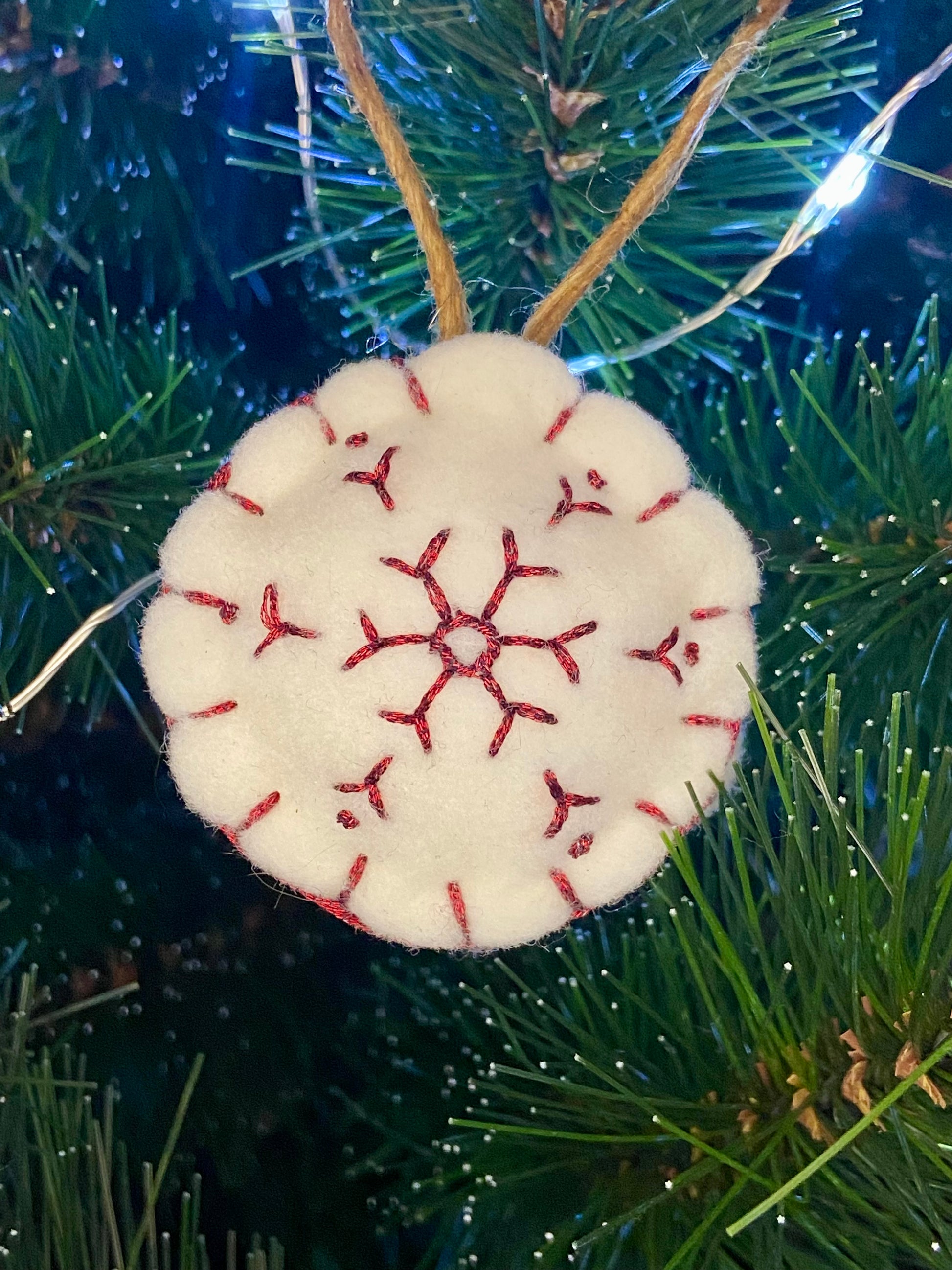 Chaque flocon est réalisé à la main dans une feutrine blanche moelleuse, puis délicatement brodé au fil coloré — doré, argenté, rouge ou vert — pour rappeler la magie des décorations d’hiver.