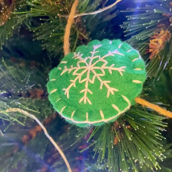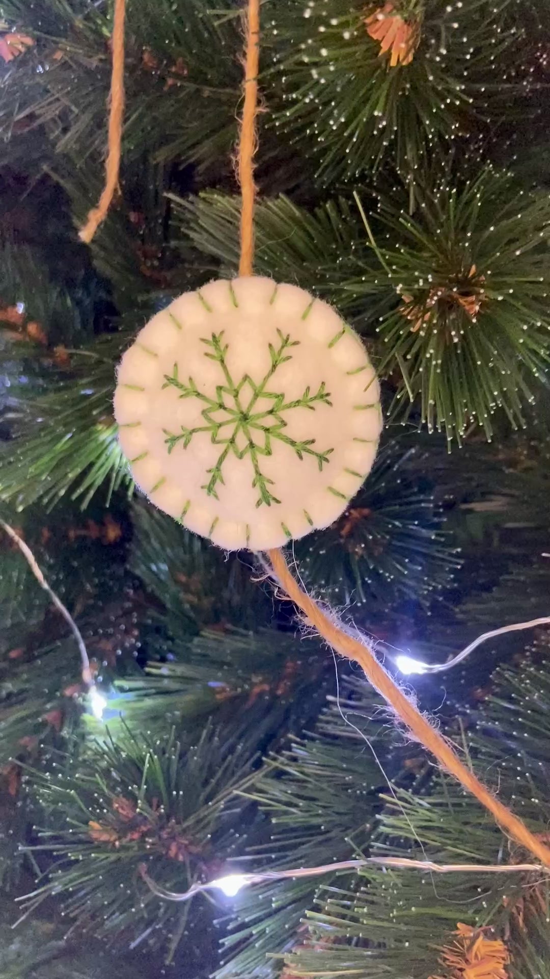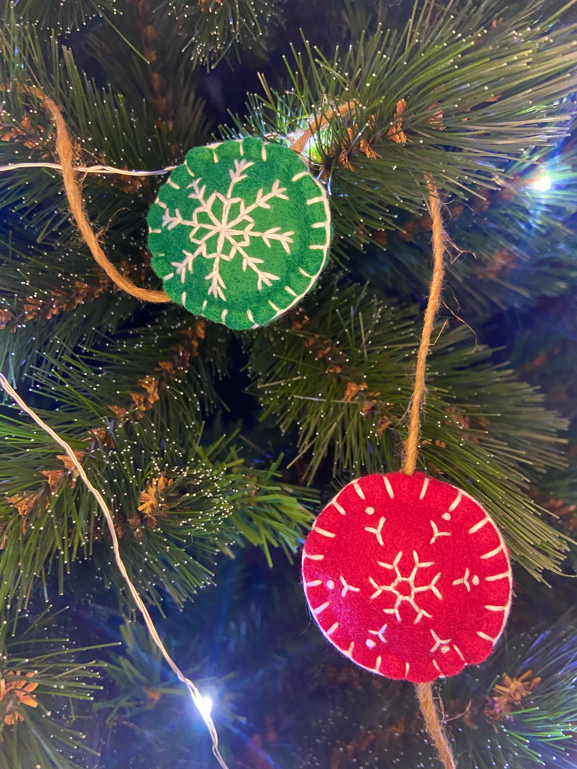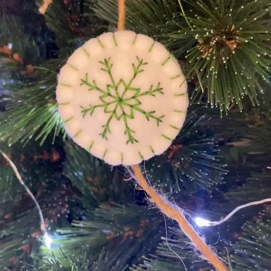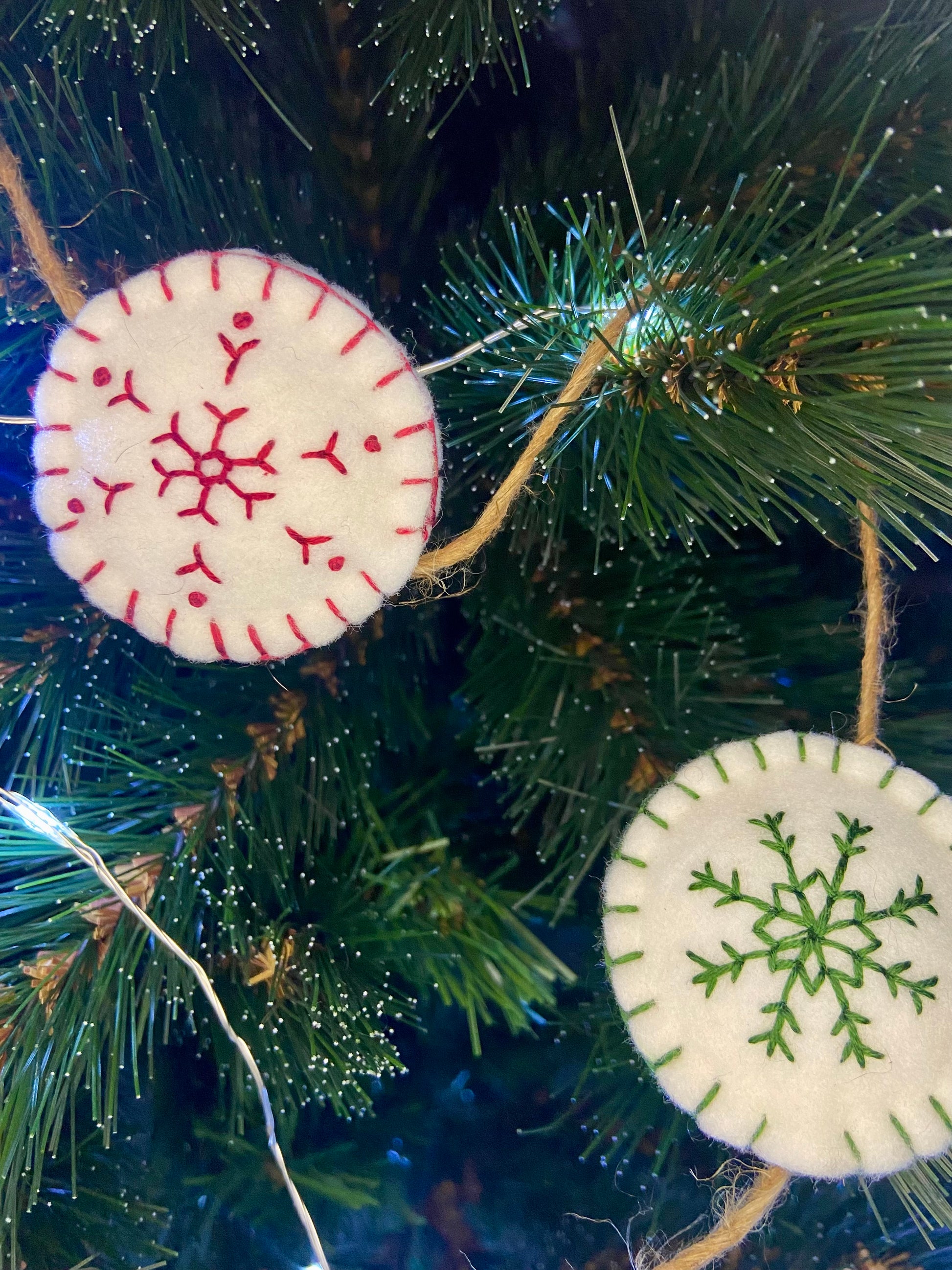 Les flocons sont réalisés en feutrine blanche, rouge et verte, et brodés au fil DMC blanc ou coloré, selon le modèle.
